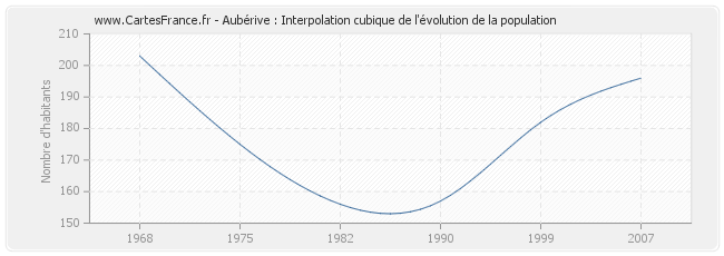 Cette courbe reprend l'historique de la population d'Aubérive de 1968 à 2007 en interpolation cubique. Ceci permet d'obtenir plus précisément la population de la commune d'Aubérive les années ou aucun recensement n'a été effectué.