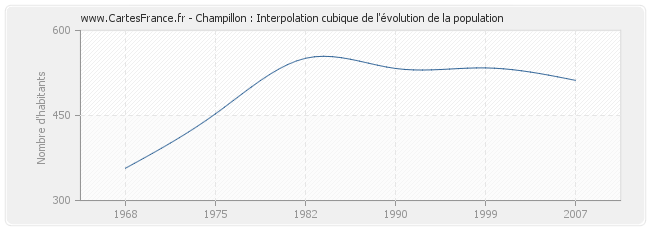 Cette courbe reprend l'historique de la population de Champillon de 1968 à 2007 en interpolation cubique. Ceci permet d'obtenir plus précisément la population de la commune de Champillon les années ou aucun recensement n'a été effectué.