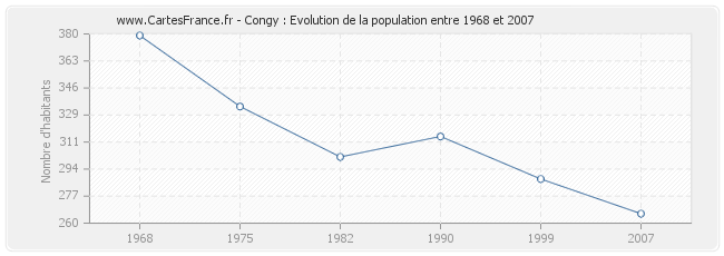 La population de Congy était de 266 habitants en 2007, 288 habitants en 1999, 315 habitants en 1990, 302 habitants en 1982, 334 habitants en 1975 et 379 habitants en 1968.