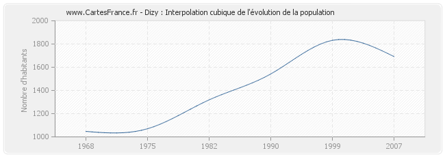 Cette courbe reprend l'historique de la population de Dizy de 1968 à 2007 en interpolation cubique. Ceci permet d'obtenir plus précisément la population de la commune de Dizy les années ou aucun recensement n'a été effectué.