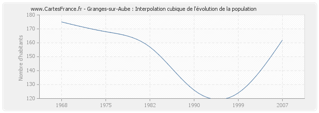 Cette courbe reprend l'historique de la population de Granges-sur-Aube de 1968 à 2007 en interpolation cubique. Ceci permet d'obtenir plus précisément la population de la commune de Granges-sur-Aube les années ou aucun recensement n'a été effectué.