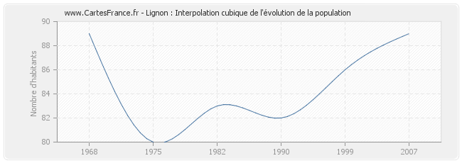 Cette courbe reprend l'historique de la population de Lignon de 1968 à 2007 en interpolation cubique. Ceci permet d'obtenir plus précisément la population de la commune de Lignon les années ou aucun recensement n'a été effectué.