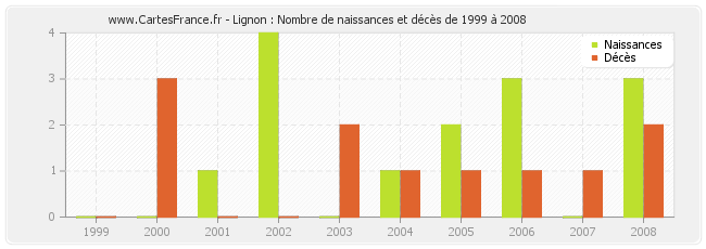 Lignon : évolution des naissances et décès de 1968 à 2007