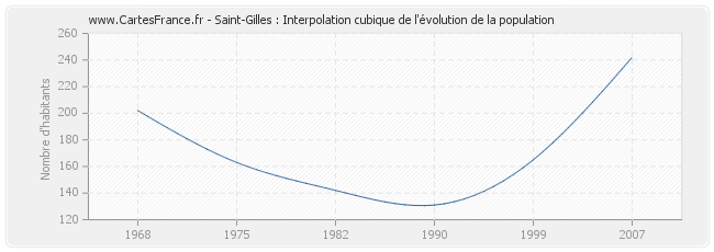 Cette courbe reprend l'historique de la population de Saint-Gilles de 1968 à 2007 en interpolation cubique. Ceci permet d'obtenir plus précisément la population de la commune de Saint-Gilles les années ou aucun recensement n'a été effectué.