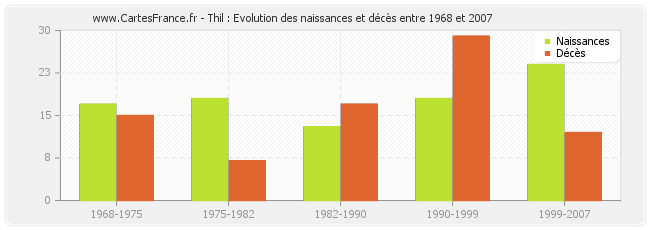 La population de Thil était de 275 habitants en 2007, 242 habitants en 1999, 257 habitants en 1990, 272 habitants en 1982, 218 habitants en 1975 et 186 habitants en 1968.