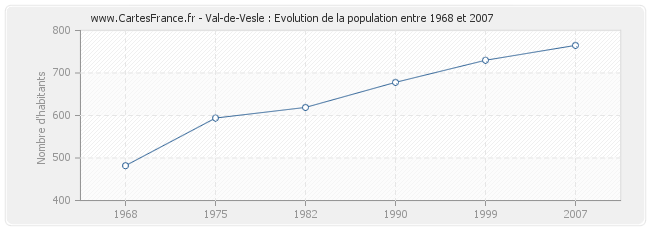 La population de Val-de-Vesle était de 765 habitants en 2007, 730 habitants en 1999, 678 habitants en 1990, 619 habitants en 1982, 594 habitants en 1975 et 482 habitants en 1968.