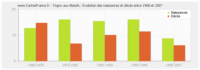 Togny-aux-Bœufs : évolution des naissances et décès de 1968 à 2007