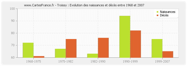 Troissy : évolution des naissances et décès de 1968 à 2007