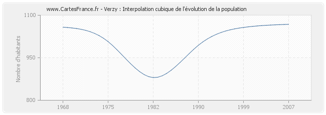 Cette courbe reprend l'historique de la population de Verzy de 1968 à 2007 en interpolation cubique. Ceci permet d'obtenir plus précisément la population de la commune de Verzy les années ou aucun recensement n'a été effectué.