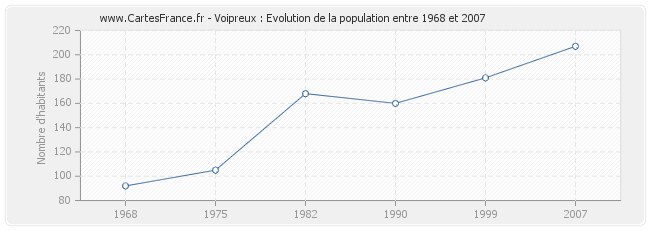 La population de Voipreux était de 207 habitants en 2007, 181 habitants en 1999, 160 habitants en 1990, 168 habitants en 1982, 105 habitants en 1975 et 92 habitants en 1968.
