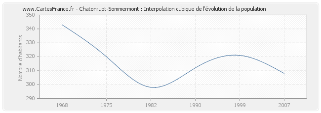 Cette courbe reprend l'historique de la population de Chatonrupt-Sommermont de 1968 à 2007 en interpolation cubique. Ceci permet d'obtenir plus précisément la population de la commune de Chatonrupt-Sommermont les années ou aucun recensement n'a été effectué.