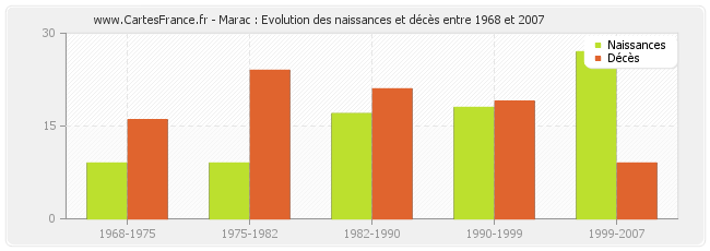 La population de Marac était de 226 habitants en 2007, 193 habitants en 1999, 162 habitants en 1990, 174 habitants en 1982, 181 habitants en 1975 et 201 habitants en 1968.