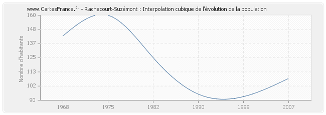 Cette courbe reprend l'historique de la population de Rachecourt-Suzémont de 1968 à 2007 en interpolation cubique. Ceci permet d'obtenir plus précisément la population de la commune de Rachecourt-Suzémont les années ou aucun recensement n'a été effectué.