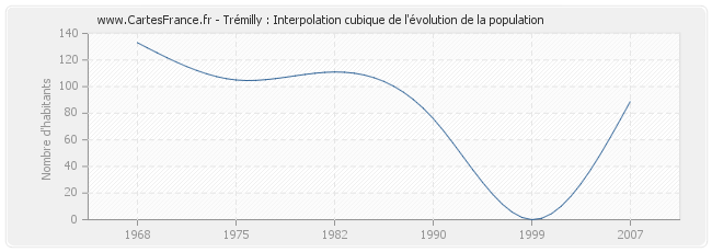Cette courbe reprend l'historique de la population de Trémilly de 1968 à 2007 en interpolation cubique. Ceci permet d'obtenir plus précisément la population de la commune de Trémilly les années ou aucun recensement n'a été effectué.
