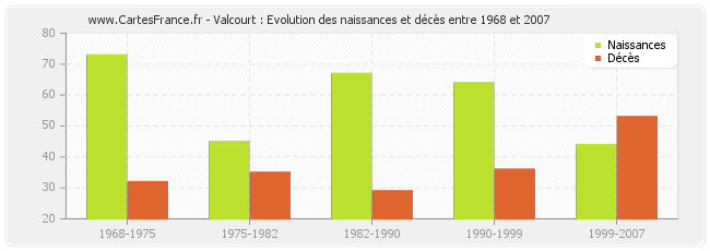 Valcourt : évolution des naissances et décès de 1968 à 2007