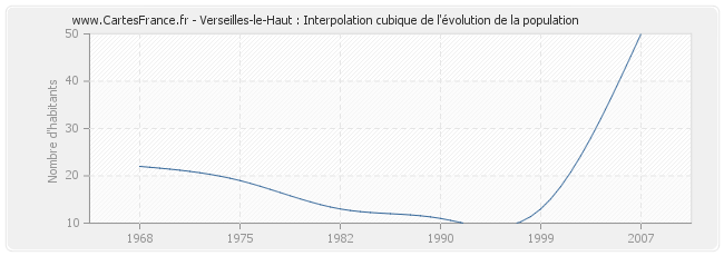 Cette courbe reprend l'historique de la population de Verseilles-le-Haut de 1968 à 2007 en interpolation cubique. Ceci permet d'obtenir plus précisément la population de la commune de Verseilles-le-Haut les années ou aucun recensement n'a été effectué.