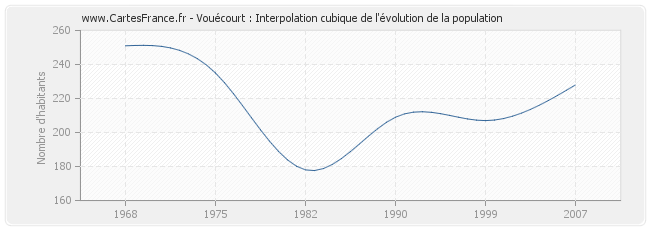 Cette courbe reprend l'historique de la population de Vouécourt de 1968 à 2007 en interpolation cubique. Ceci permet d'obtenir plus précisément la population de la commune de Vouécourt les années ou aucun recensement n'a été effectué.