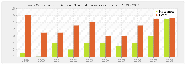 Alexain : évolution des naissances et décès de 1968 à 2007