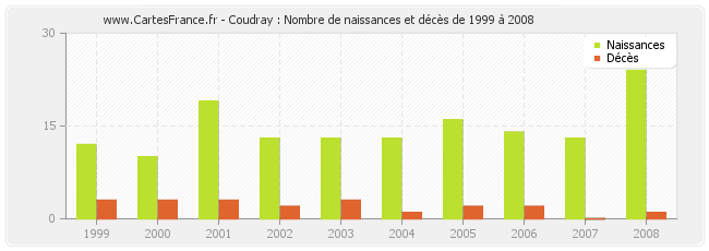 Coudray : évolution des naissances et décès de 1968 à 2007