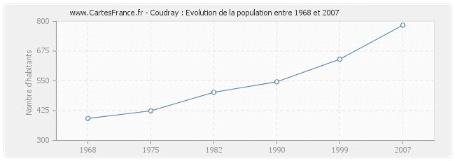 Cette courbe reprend l'historique de la population de Coudray de 1968 à 2007 en interpolation cubique. Ceci permet d'obtenir plus précisément la population de la commune de Coudray les années ou aucun recensement n'a été effectué.