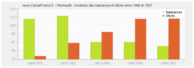 Montaudin : évolution des naissances et décès de 1968 à 2007