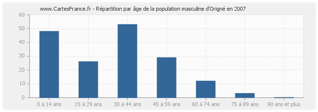 Répartition de la population masculine d'Origné par âge en 2007 :