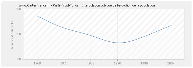 Cette courbe reprend l'historique de la population de Ruillé-Froid-Fonds de 1968 à 2007 en interpolation cubique. Ceci permet d'obtenir plus précisément la population de la commune de Ruillé-Froid-Fonds les années ou aucun recensement n'a été effectué.