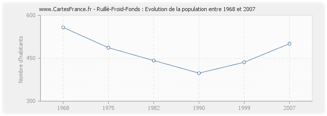 La population de Ruillé-Froid-Fonds était de 501 habitants en 2007, 436 habitants en 1999, 398 habitants en 1990, 442 habitants en 1982, 487 habitants en 1975 et 558 habitants en 1968.