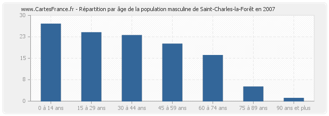 - Hommes de 0 à 14 ans habitant Saint-Charles-la-Forêt : 27