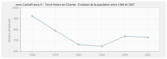 La population de Torcé-Viviers-en-Charnie était de 729 habitants en 2007, 739 habitants en 1999, 647 habitants en 1990, 663 habitants en 1982, 791 habitants en 1975 et 925 habitants en 1968.