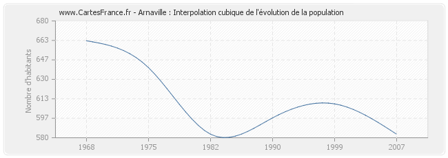 Cette courbe reprend l'historique de la population d'Arnaville de 1968 à 2007 en interpolation cubique. Ceci permet d'obtenir plus précisément la population de la commune d'Arnaville les années ou aucun recensement n'a été effectué.