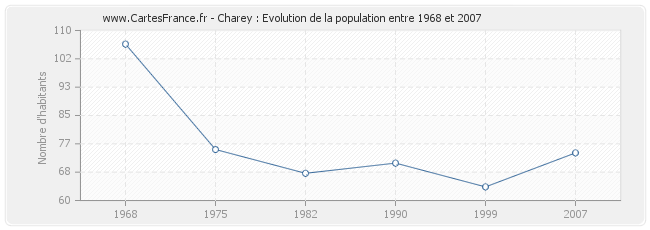 Cette courbe reprend l'historique de la population de Charey de 1968 à 2007 en interpolation cubique. Ceci permet d'obtenir plus précisément la population de la commune de Charey les années ou aucun recensement n'a été effectué.