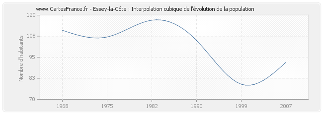 Cette courbe reprend l'historique de la population d'Essey-la-Côte de 1968 à 2007 en interpolation cubique. Ceci permet d'obtenir plus précisément la population de la commune d'Essey-la-Côte les années ou aucun recensement n'a été effectué.