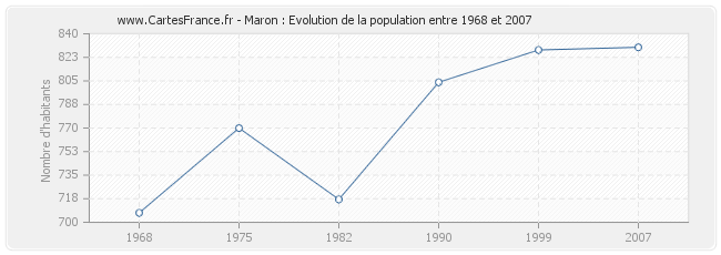 Cette courbe reprend l'historique de la population de Maron de 1968 à 2007 en interpolation cubique. Ceci permet d'obtenir plus précisément la population de la commune de Maron les années ou aucun recensement n'a été effectué.