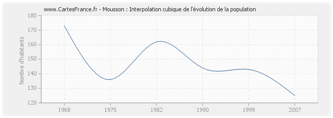 Cette courbe reprend l'historique de la population de Mousson de 1968 à 2007 en interpolation cubique. Ceci permet d'obtenir plus précisément la population de la commune de Mousson les années ou aucun recensement n'a été effectué.