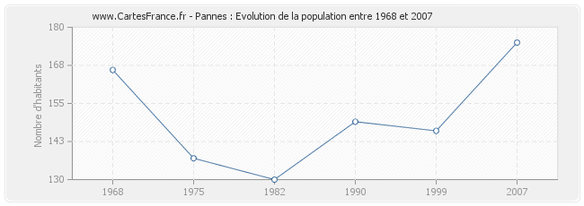La population de Pannes était de 175 habitants en 2007, 146 habitants en 1999, 149 habitants en 1990, 130 habitants en 1982, 137 habitants en 1975 et 166 habitants en 1968.
