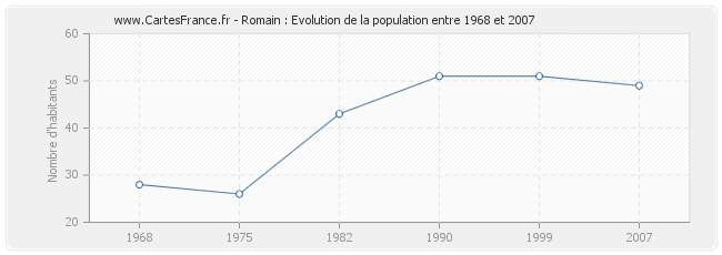 La population de Romain était de 49 habitants en 2007, 51 habitants en 1999, 51 habitants en 1990, 43 habitants en 1982, 26 habitants en 1975 et 28 habitants en 1968.