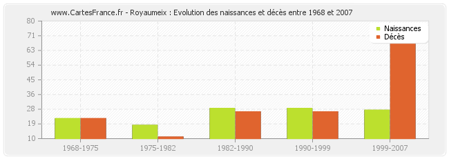Royaumeix : évolution des naissances et décès de 1968 à 2007