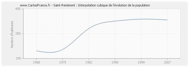 Cette courbe reprend l'historique de la population de Saint-Remimont de 1968 à 2007 en interpolation cubique. Ceci permet d'obtenir plus précisément la population de la commune de Saint-Remimont les années ou aucun recensement n'a été effectué.