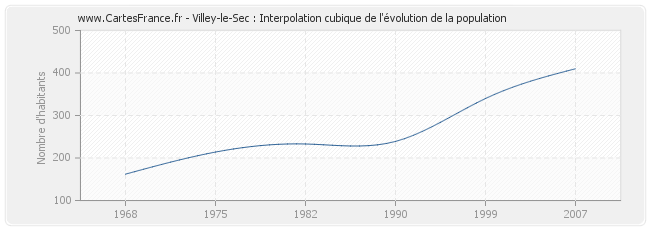 Cette courbe reprend l'historique de la population de Villey-le-Sec de 1968 à 2007 en interpolation cubique. Ceci permet d'obtenir plus précisément la population de la commune de Villey-le-Sec les années ou aucun recensement n'a été effectué.