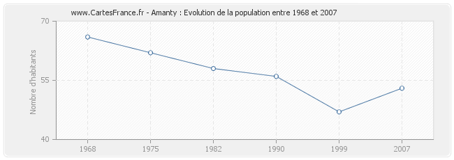 La population d'Amanty était de 53 habitants en 2007, 47 habitants en 1999, 56 habitants en 1990, 58 habitants en 1982, 62 habitants en 1975 et 66 habitants en 1968.