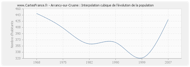 Cette courbe reprend l'historique de la population d'Arrancy-sur-Crusne de 1968 à 2007 en interpolation cubique. Ceci permet d'obtenir plus précisément la population de la commune d'Arrancy-sur-Crusne les années ou aucun recensement n'a été effectué.