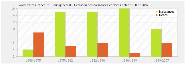 Baudignécourt : évolution des naissances et décès de 1968 à 2007