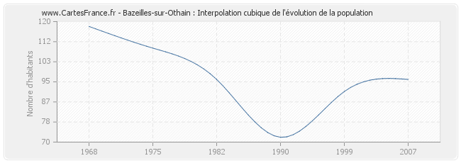 Cette courbe reprend l'historique de la population de Bazeilles-sur-Othain de 1968 à 2007 en interpolation cubique. Ceci permet d'obtenir plus précisément la population de la commune de Bazeilles-sur-Othain les années ou aucun recensement n'a été effectué.