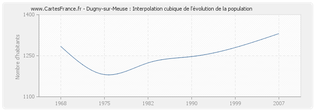 Cette courbe reprend l'historique de la population de Dugny-sur-Meuse de 1968 à 2007 en interpolation cubique. Ceci permet d'obtenir plus précisément la population de la commune de Dugny-sur-Meuse les années ou aucun recensement n'a été effectué.
