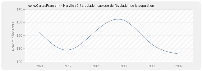 Cette courbe reprend l'historique de la population de Harville de 1968 à 2007 en interpolation cubique. Ceci permet d'obtenir plus précisément la population de la commune de Harville les années ou aucun recensement n'a été effectué.