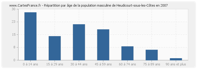 - Hommes de 0 à 14 ans habitant Heudicourt-sous-les-Côtes : 28