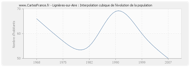 Cette courbe reprend l'historique de la population de Lignières-sur-Aire de 1968 à 2007 en interpolation cubique. Ceci permet d'obtenir plus précisément la population de la commune de Lignières-sur-Aire les années ou aucun recensement n'a été effectué.