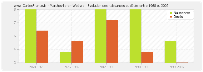 Marchéville-en-Woëvre : évolution des naissances et décès de 1968 à 2007
