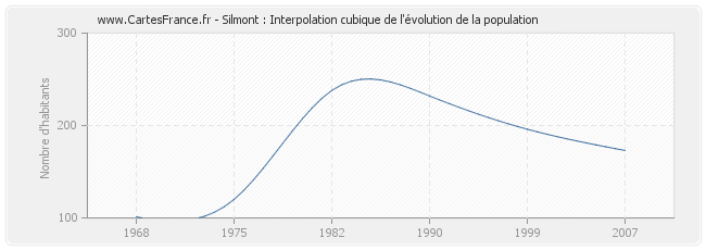 Cette courbe reprend l'historique de la population de Silmont de 1968 à 2007 en interpolation cubique. Ceci permet d'obtenir plus précisément la population de la commune de Silmont les années ou aucun recensement n'a été effectué.